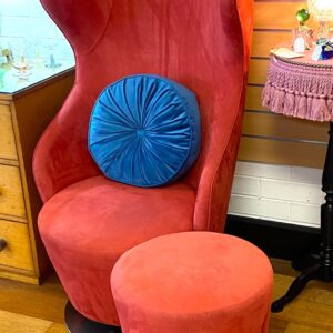 High back suede swivel chair on a chrome base with matching adjustable ottoman. Each piece has the ‘Clarins’ cosmetic company’s logo sewn into the fabric. Possibly a Clarins promotional chair. France circa 1970