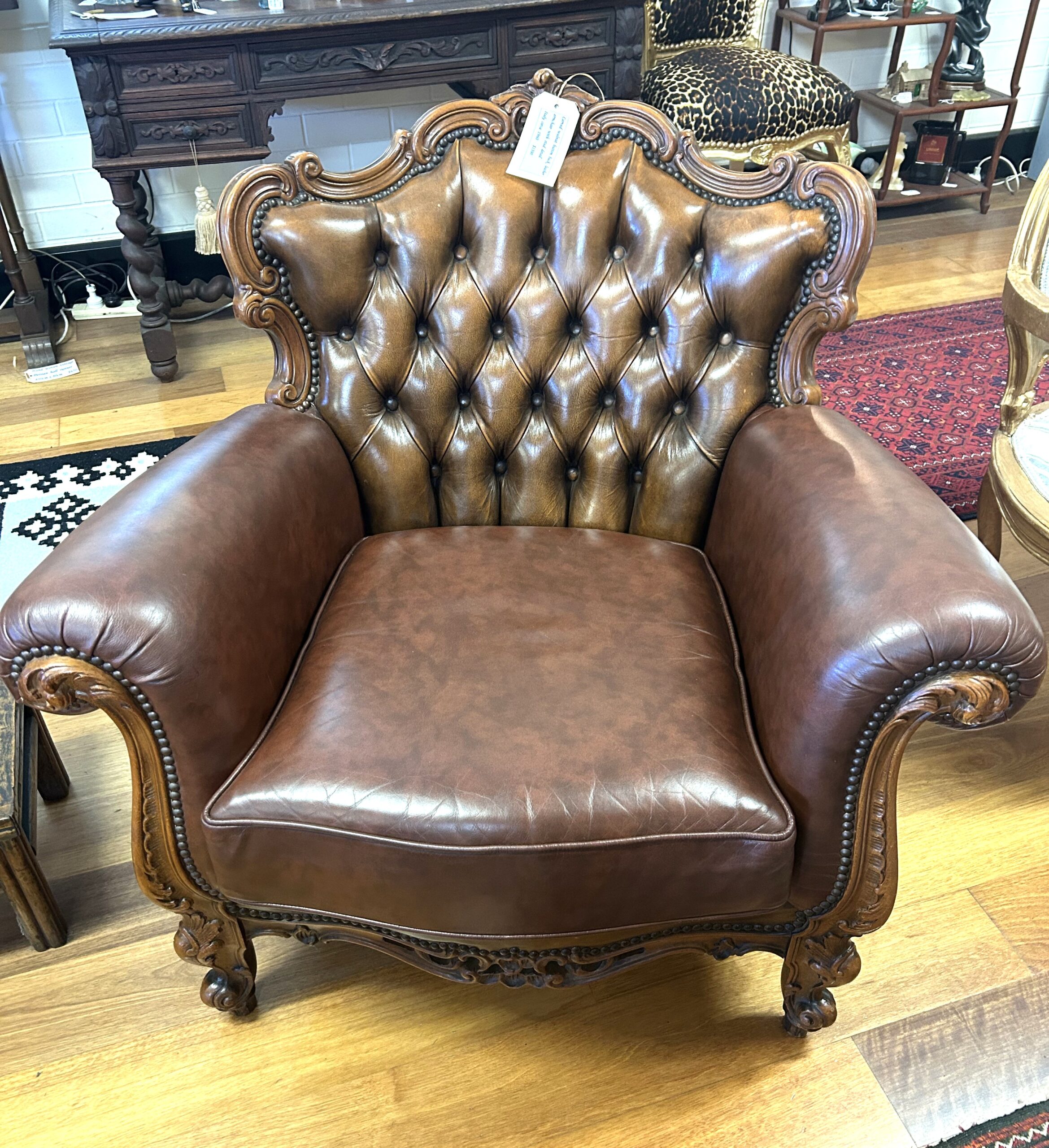 Carved walnut button back leather armchair with stud detail Italy circa 1960 (another available)